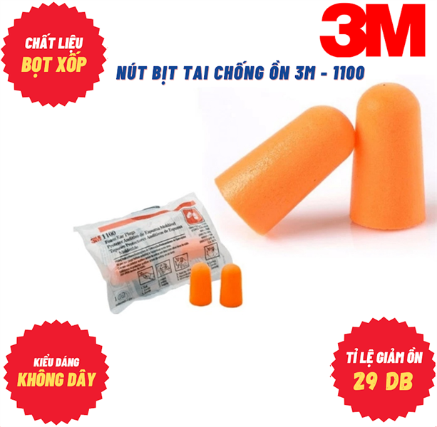Nút tai dạng bọt xốp không dây 3M™ 1100.Thiết kế mềm, dạng nón dễ dàng kín khít tai khi mang.
